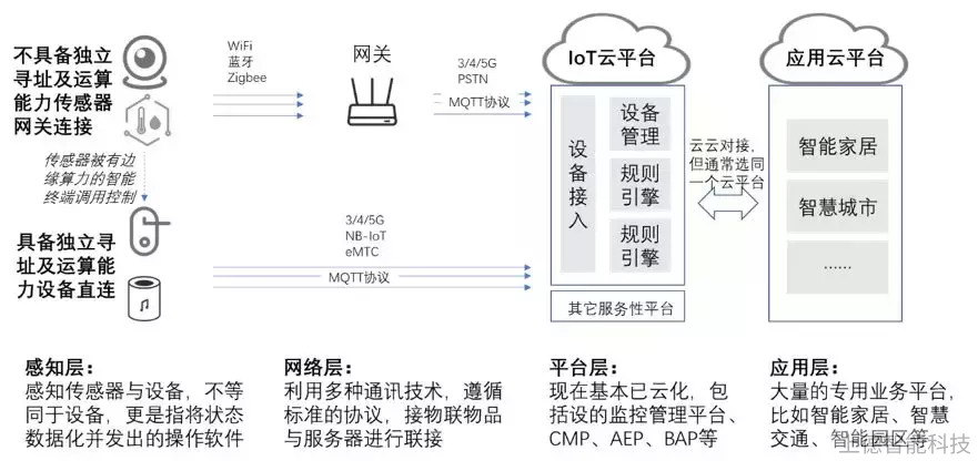 物聯(lián)網(wǎng)常分為四層:感知、網(wǎng)絡(luò)、平臺(tái)和應(yīng)用層;也有另一種常見(jiàn)的分法,是把平臺(tái)層并入應(yīng)用層,因此定義為感知、網(wǎng)絡(luò)和應(yīng)用層。各層的組成和對(duì)應(yīng)關(guān)系如下: