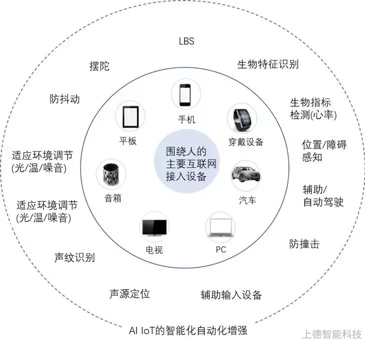 以下的圖示,簡(jiǎn)單地羅列了未來(lái)常見(jiàn)的互聯(lián)網(wǎng)接入設(shè)備,如何日益集成更多的IoT設(shè)備,并在人工智能的輔助下,實(shí)現(xiàn)更智能、更強(qiáng)大的功能,從而更好地提高原來(lái)互聯(lián)網(wǎng)應(yīng)用的體驗(yàn):
